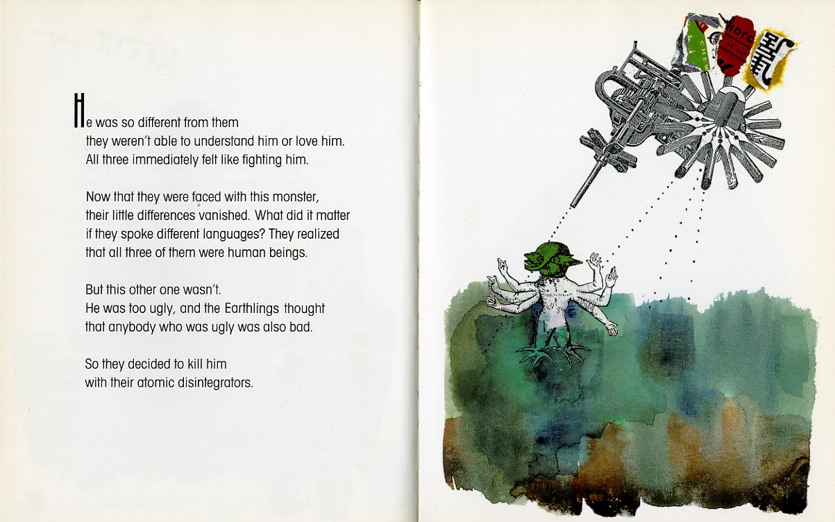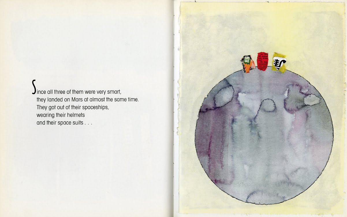 The charming little book  focuses on three astronauts – an American, a Russian, and a Chinese – who each individually depart Earth at the same time on a mission to Mars. Arriving at their destination simultaneously, at first they consider each other to be adversaries, but the desolate conditions of Mars helps them to recognize that their differences are inconsequential when compared to what they share in common. This is reinforced when they meet a six-armed Martian, and not being able to communicate they discover that their rivalry has moved from each other to the actual alien. Happily they soon discover that the Martian has emotions just like their own.