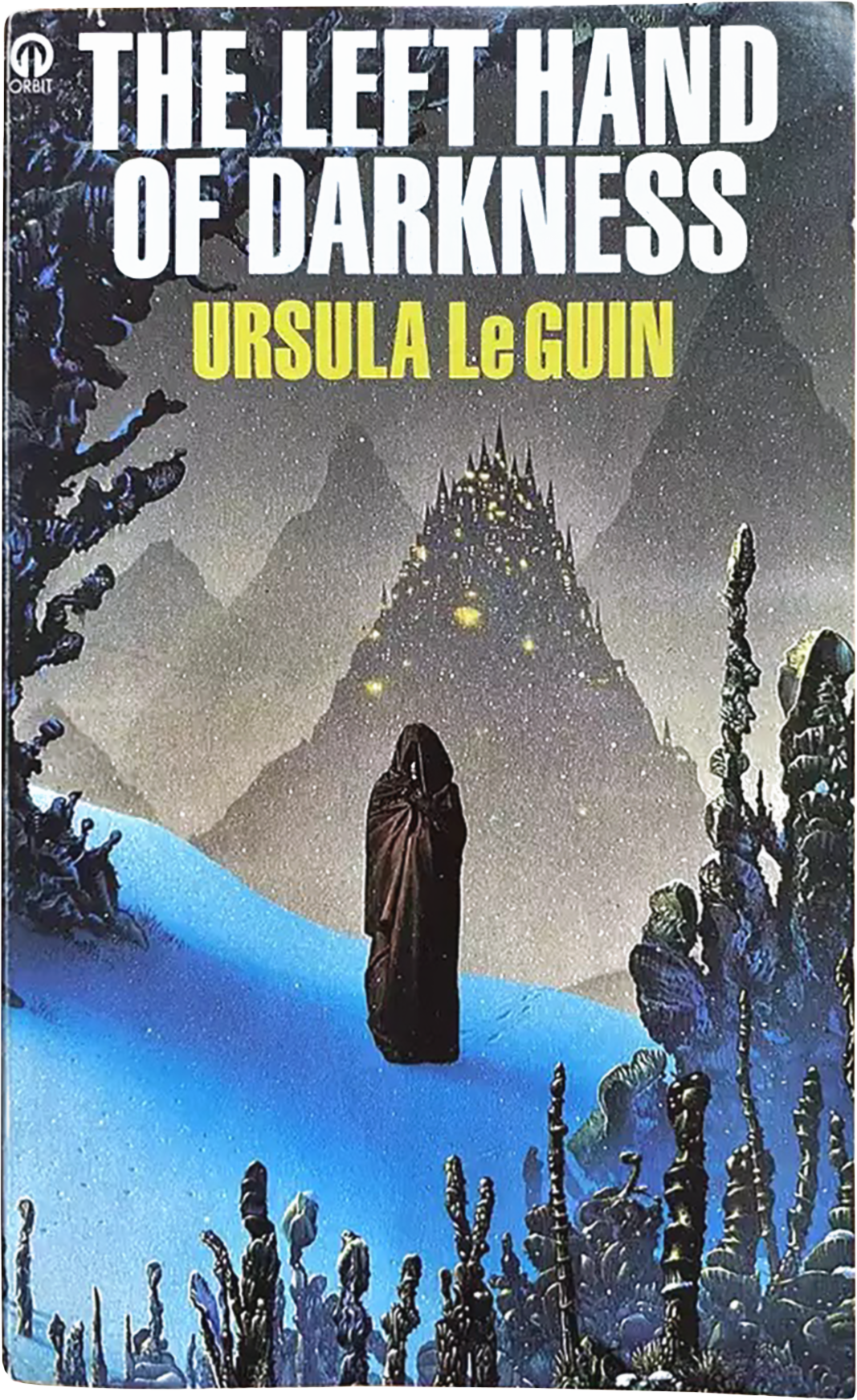 Tim White’s intensely felt illustration for Le Guin is a romance of winter: blue snow-covered hill, a stipple of snowfall, alien vegetation, glittering lights against the dark – growing up in the tropics, it had an aching appeal for me. (The central cowled figure is an exact contemporary of the movie poster of John Fowles’ The French Lieutenant’s Woman featuring a cowled Meryl Streep.) The story opens with the brilliant: ‘The King was pregnant’, and climaxes in a sublime, superbly sustained, emotionally harrowing escape over a glacier. Ironically, my own mental images of the story have nothing to do with the cover (as a cover designer I wonder, how is this possible?) – I imagine an action film by Kurosawa, fleet and austere, with subtitles and a glassy, angular soundtrack, and as Le Guin insisted, without any white people.