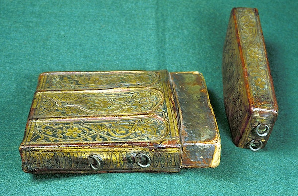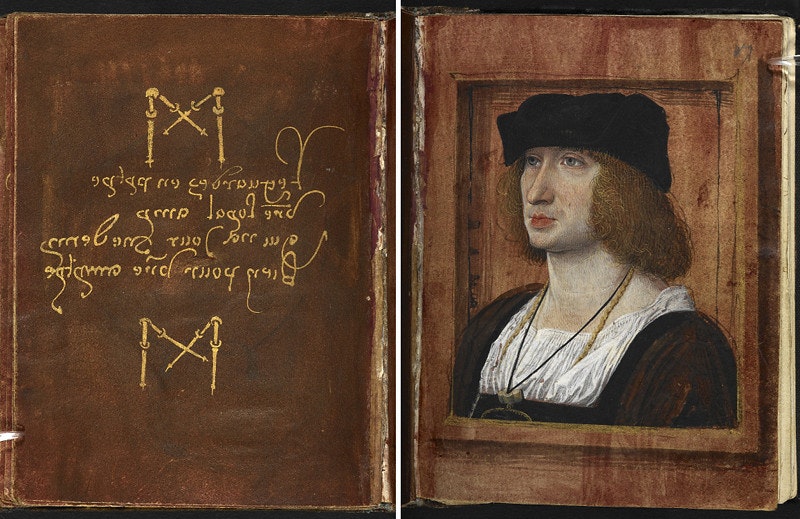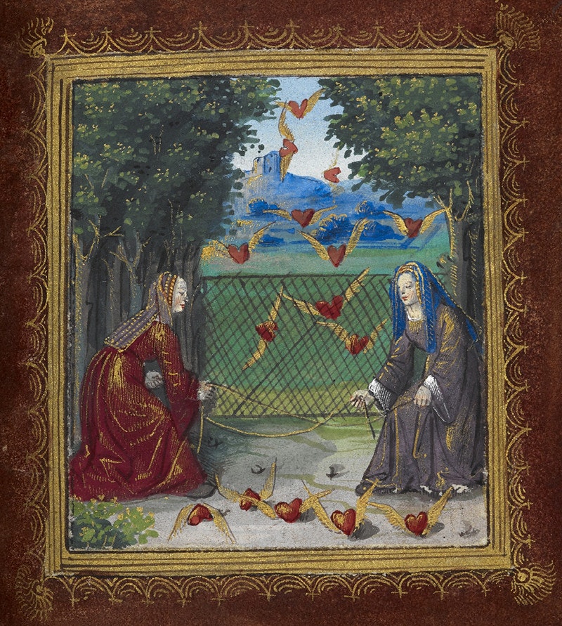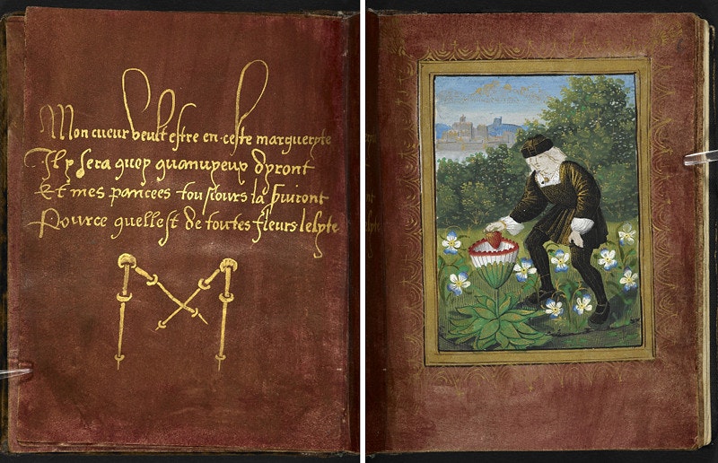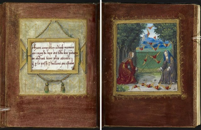 Your Valentine’s Day gift will have to be extraordinary to top the Petit Livre d’Amour (Little Book of Love). This very elaborate handmade book was given by the 16th-century French poet Pierre Salas to his then lover and future wife Marguerite Bullioud. It measures just 5 by 3.7 inches, hand-written by Salas with gold ink and gorgeously illuminated by an artist identified as the “Master of the Chronique scandaleuseas”. The volume begins with a few pages of prose describing the relationship between the poet and the woman he loves. The rest of the book follows with 12 “iconologues”, a combination of prose and poetry on the left-hand page – including the initials M, for Marguerite and P, for Pierre, scattered about in various forms – and on the right-hand page a corresponding picture. Five of these relate to love, the others to more prosaic topics.