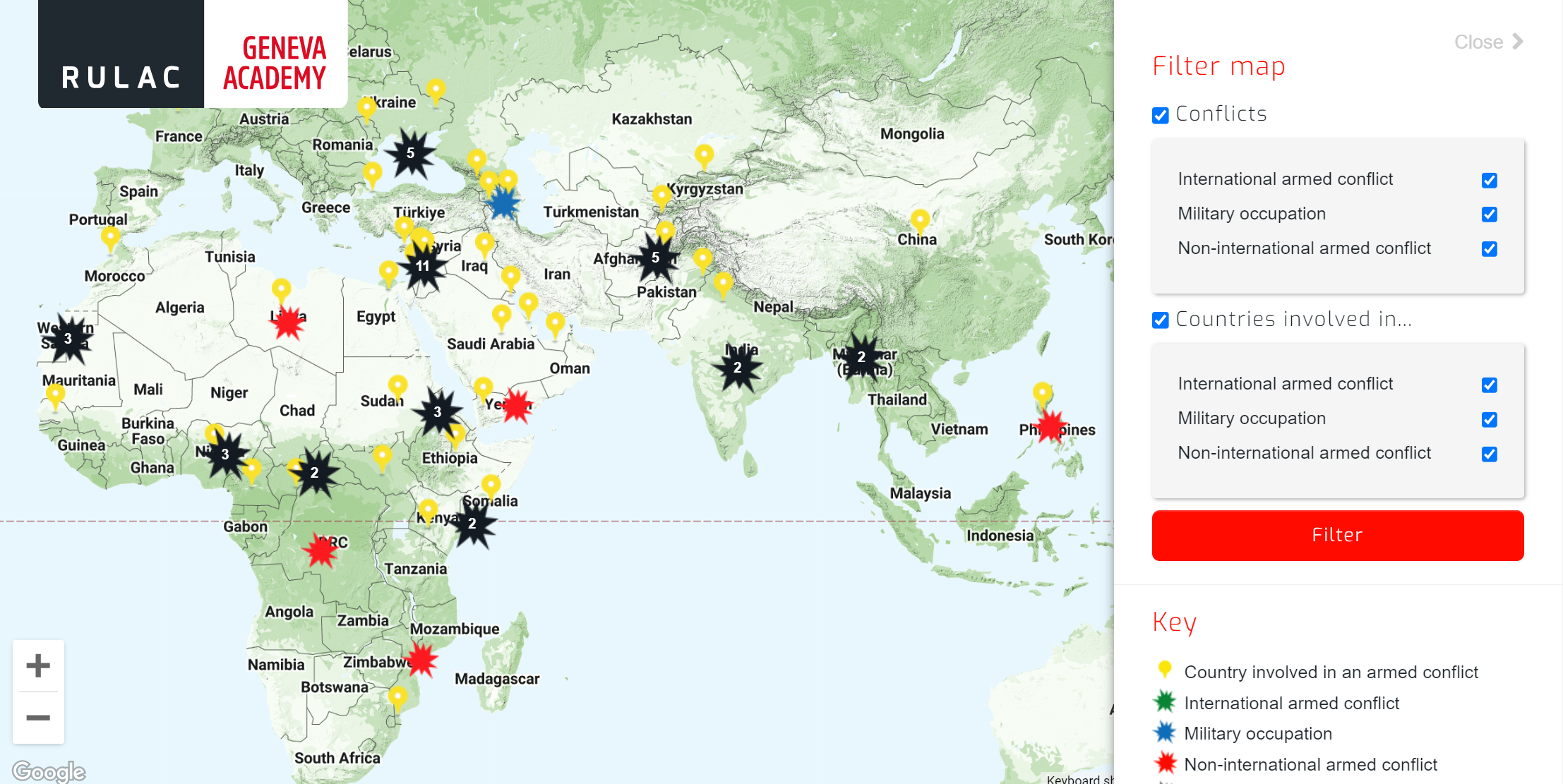The Rule of Law in Armed Conflicts (RULAC) online portal has been mapped armed conflicts around the world since 2007. The map currently shows that at least “55 states and more than 70 armed non-State actors” are presently involved in armed conflicts.
