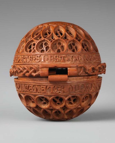 Ball-shaped wood carvings that open into halves and hide inside an astonishingly detailed and extremely intricate religious scenes. Handcarvings so miniscule that you can hardly see the smallest detail without magnifying glass. There can be as many as 50 detaily carved figures inside one scene. Probably the smallest and most intricate wood carvings in the world showcase details of clothing, armor, and architecture of their period. You can see the individual folds on their shirts and the feathers lightly decorating their hats. Their scale varies between the size of a walnut and a golf ball. Most are 2–5 cm in diameter and designed so they could be held in the palm of a hand and hung from a belt. The outside shells are decorated with carved openwork, gothic tracery, flower heads, finials, and inscriptions usually related to the narrative waiting for the viewer inside.