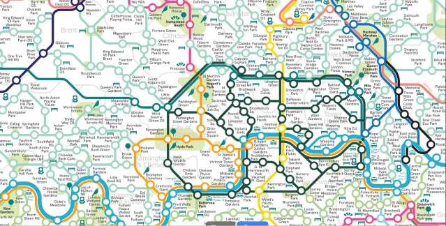 The London GreenGround Map: Created Helen Ilus, the London GreenGround Map is a wonderful sort of London transit map analog for the city’s green spaces, mapping connections and routes between public parks and gardens and areas less impacted by urbanization, allowing the user to plan routes that cover parts of the city that are yet to be paved over. “An enthusiastic walker and urban explorer Helen travelled widely, studying and working in UK, before coming up with the idea of connecting parks to tube style network for walkers. Fan of Harry Beck’s London Tube map she wondered what would happen combining the schematic mapping with walking routes. As an intuitive traveler she found the schematic maps more accessible in urban environments, but realized they also trap people in transport networks. This is why her maps give priority to green infrastructure, replacing stations with parks and tube lines with walking routes. She has also experimented with creating a walking map for libraries as well as worked with several commissioned maps.” It’s free to download or use online.