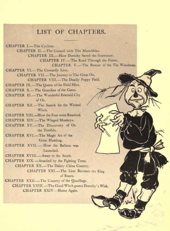 - The Wonderful Wizard of Oz (1900 illustrated copy), Publisher’s green and red illustrated cloth over boards; illustrated endpapers. Plate detached. Public Domain – Charles E. Young Research Library, UCLA. at Internet Archive