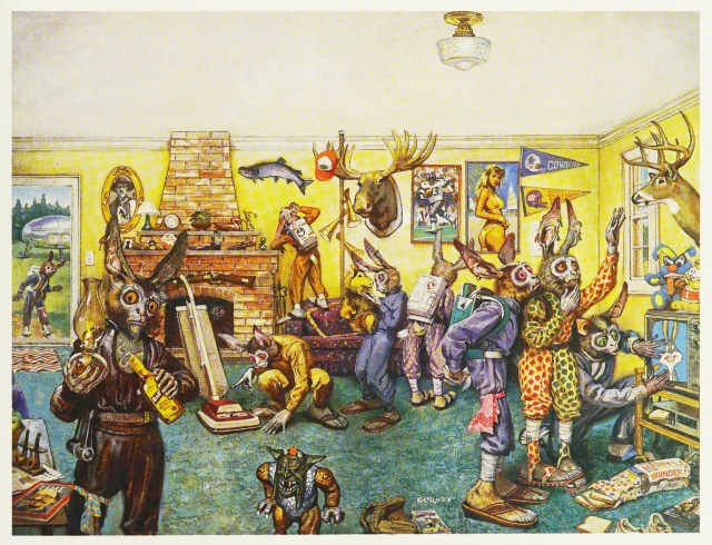 “Quozl” was painted for the 1988 Alan Dean Foster novel of the same name. The novel tells the comical tale of the Quozl, rabbit-eared aliens who land on Earth to establish a settlement or “Fist Burrow.” The Quozle, like rabbits, reproduce at an alarming rate and have been forced to travel from their overcrowded home plant of Quozlene to colonize other planets…Quozl shows the moment in which a group of these aliens explore the dwelling of a typical Earthling family.