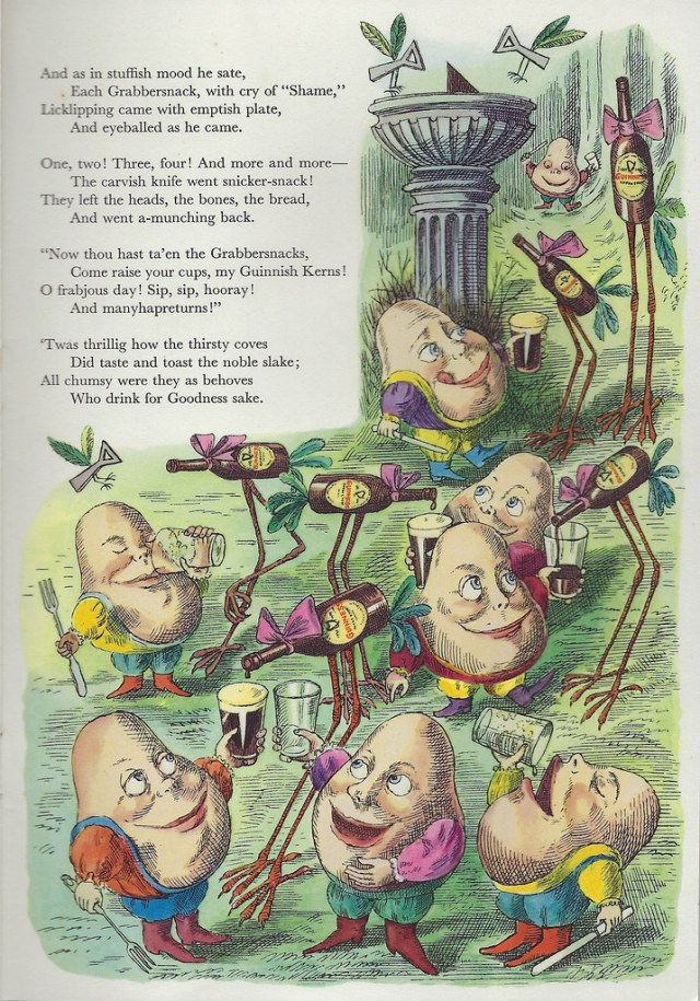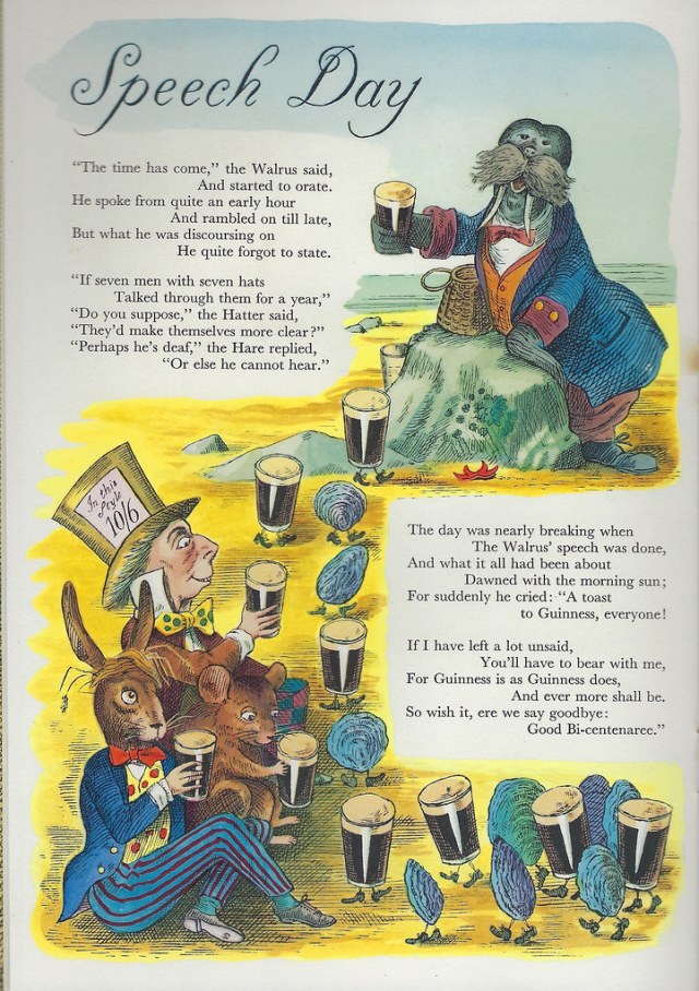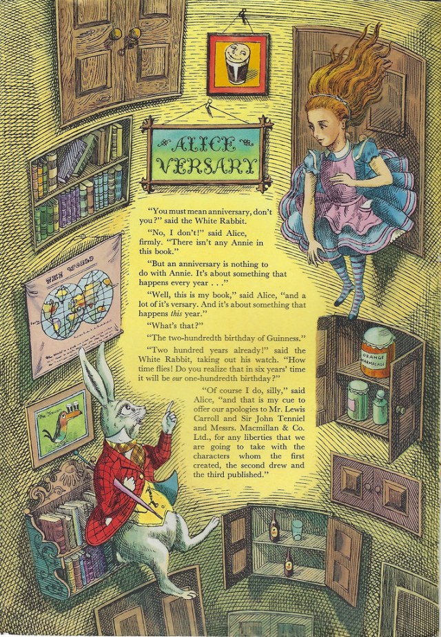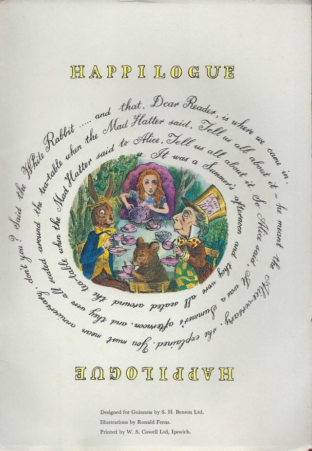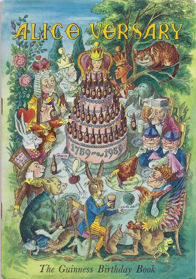 I am continually amazed by the seemingly endless variations and spinoffs of Lewis Carroll’s classic Alice in Wonderland. But even I was surprised to discover that beginning in the 1930s, Guinness beer began using Alice in Wonderland and the cast of characters from Carroll’s books in their advertising. These campaigns continued until 1959, and in addition to many ads, Guinness also published five booklets, beginning with “The Guinness Alice” in 1933, and ending with “Alice Versary: The Guinness Birthday Book,” which was published to coincide with the brewer’s 200th anniversary in 1959. All of the booklets and advertising were created by their advertising agency, S.H. Benson Ltd., with illustrations by John Gilroy and later Ronald Ferns.
