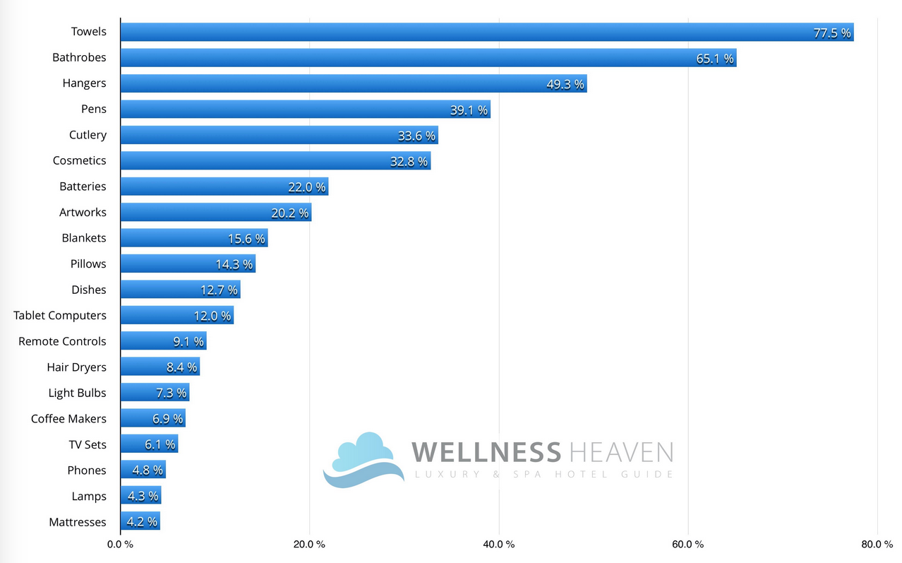 In late 2019, Wellness Heaven, a Germany-based luxury and spa hotel guide, posted the results of a survey of what was most stolen from 4- and 5-star hotel rooms. The survey also included the differences between what people from different countries tended to steal from said rooms.