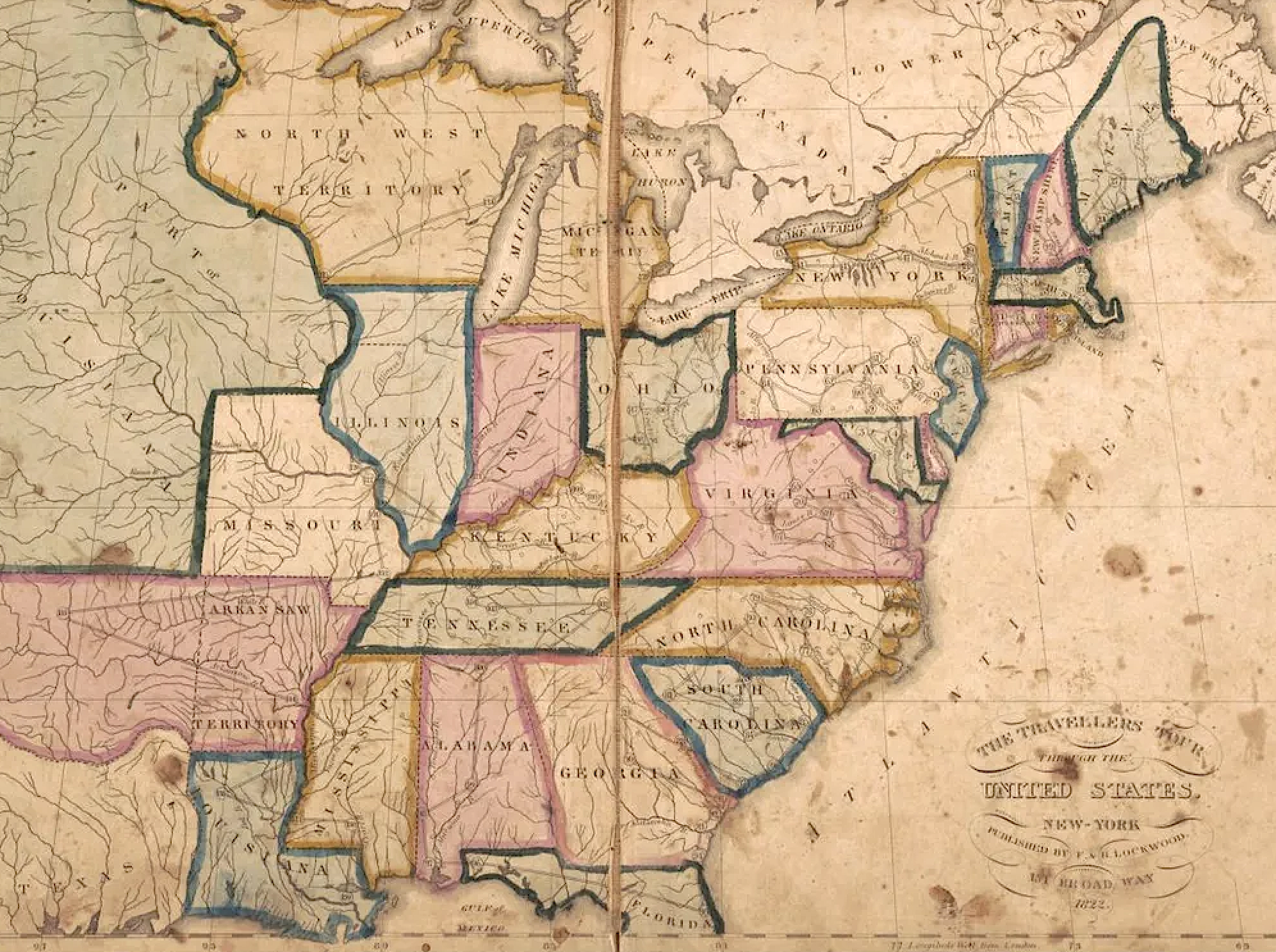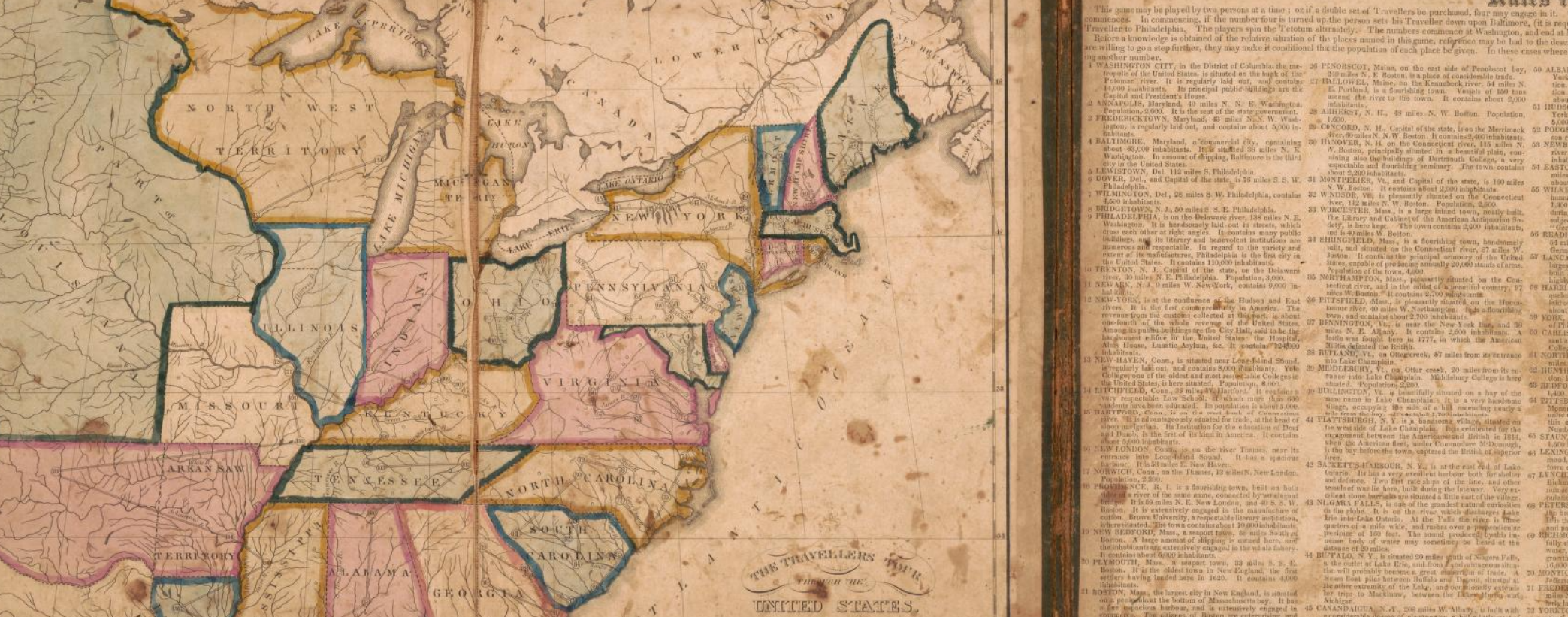 the Travelers’ Tour consists of a hand-colored map of the then-24 states and a numbered list of 139 towns and cities, ranging from New York City to New Madrid, Missouri. Beside each number is the name and description of the corresponding town.