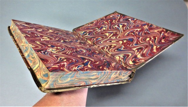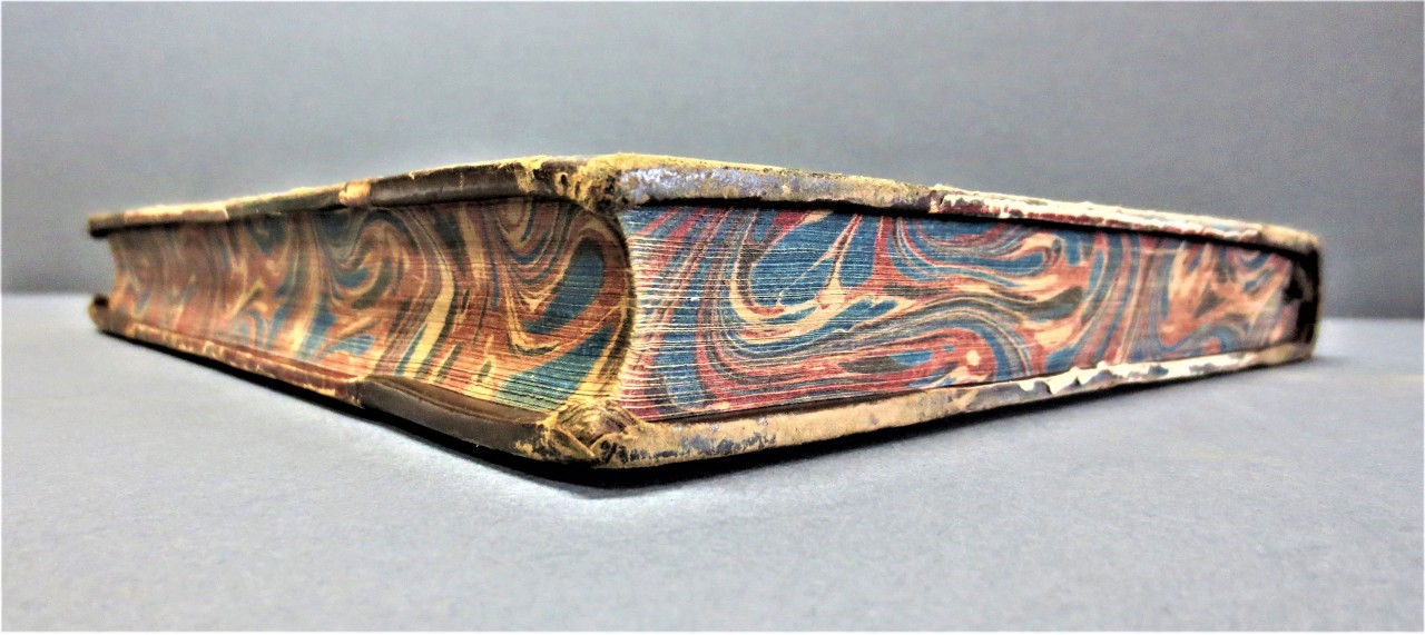 The wavy patterns on the edges, covers, and endpapers on this tooled and blind-stamped, half-bound book are from Carew’s Survey of Cornwall printed in London by Thomas Bensley for J. Faulder and Rees and Curtis in 1811. The marbled-paper pattern is what the University of Washington’s site on Patterned Papers identifies as Serpentine.