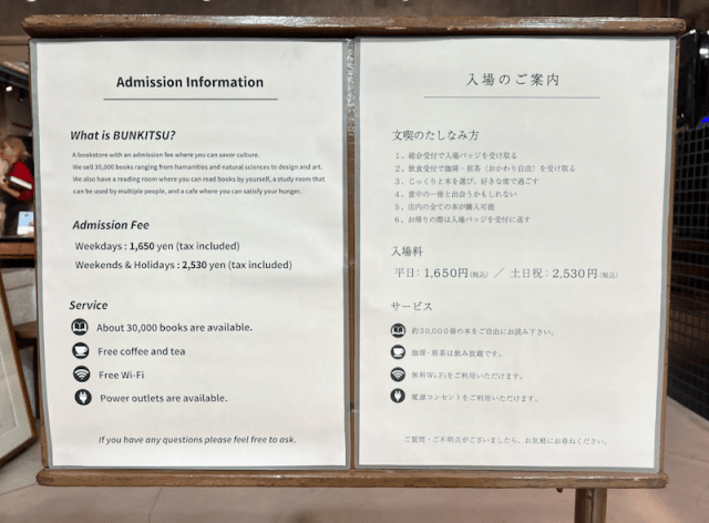 Bunkitsu (文喫) in Tokyo’s Roppongi neighborhood is a bookstore that stocks more than 30,000 titles. It also features something else: an admission fee. It costs 1,650 yen (USD $10.50) on weekdays and 2,530 yen ($16) on weekends. There’s also a “morning stroll” option for weekday AM that’s only 1,100 yen ($7).