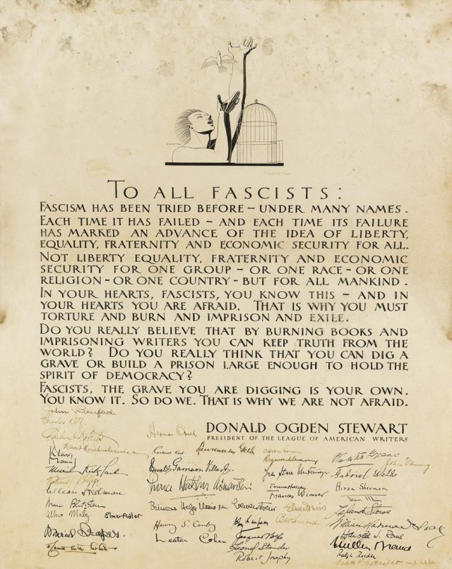 The calligraphed broadside with a statement signed by members of The League of American Writers, which features a headpiece illustration by Rockwell Kent, who was also a member of the contentious organization.
