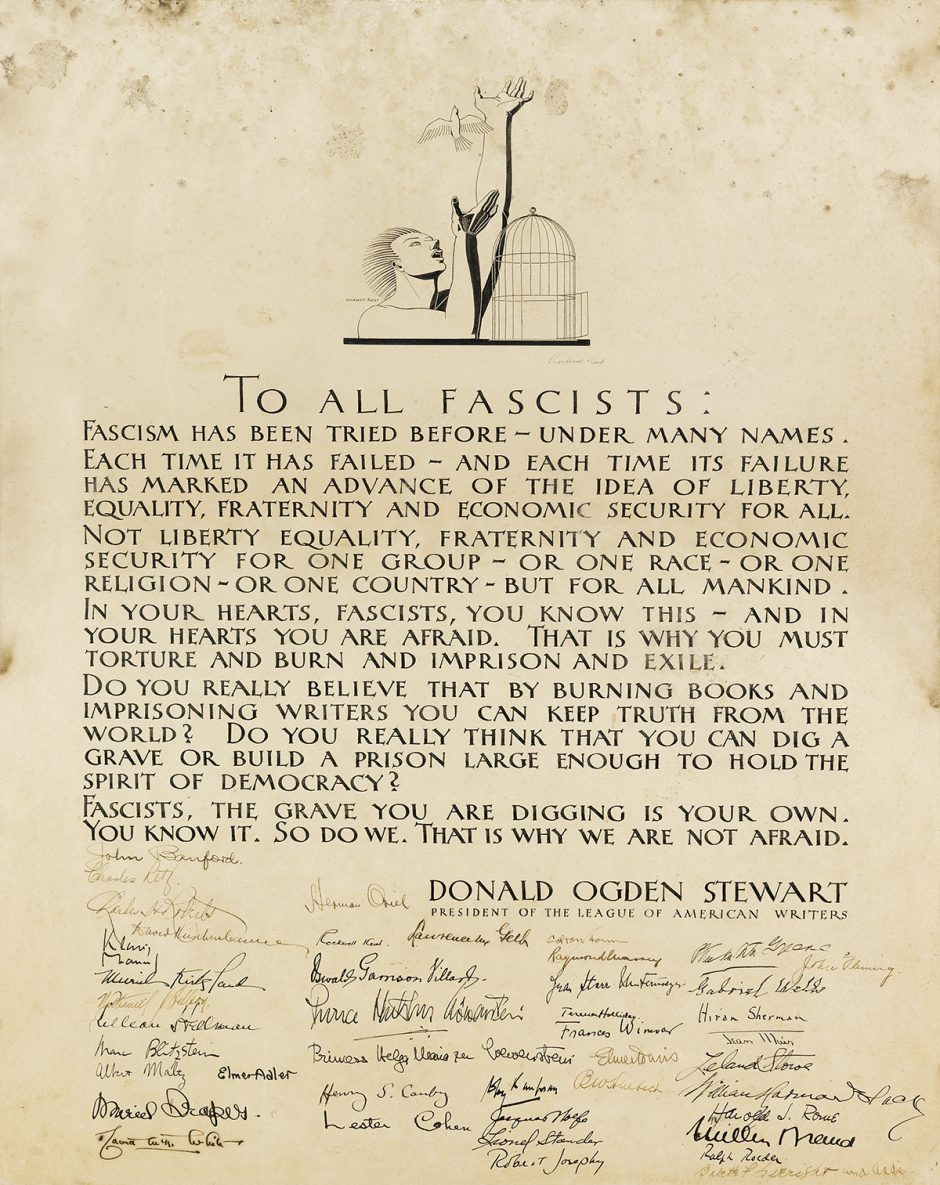 The calligraphed broadside with a statement signed by members of The League of American Writers, which features a headpiece illustration by Rockwell Kent, who was also a member of the contentious organization.