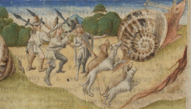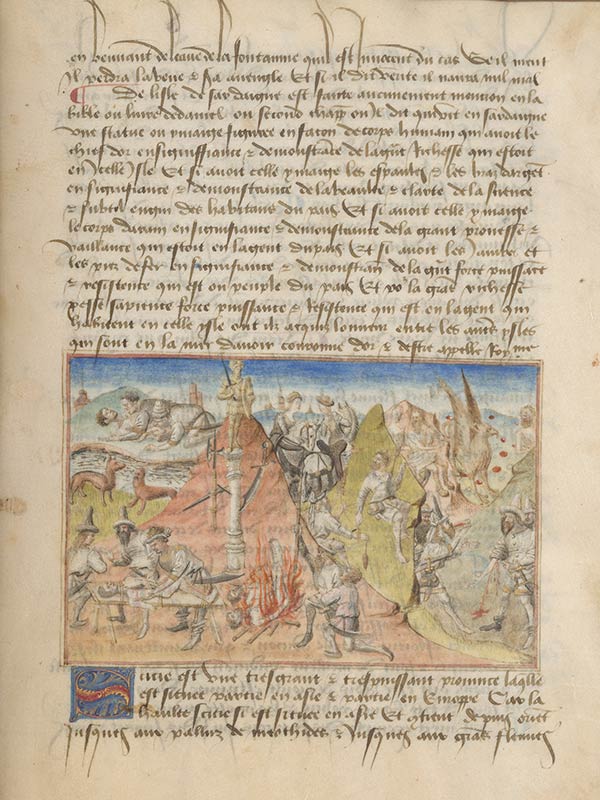 Accounts of marvels were a primary way for pre-modern people across many cultures to learn about distant lands. Stretching the limits of imagination, these accounts often become increasingly fantastical the farther one travels from home. So in the description of Sri Lanka from the Book of Marvels, both text and image focus on the region’s massive snails which are said to be so large that locals live inside their shells and hunt them like wild game. Likewise, Arabia is depicted as a region rich in precious gems which are cut from the stomachs of dragons like pearls from oysters.
