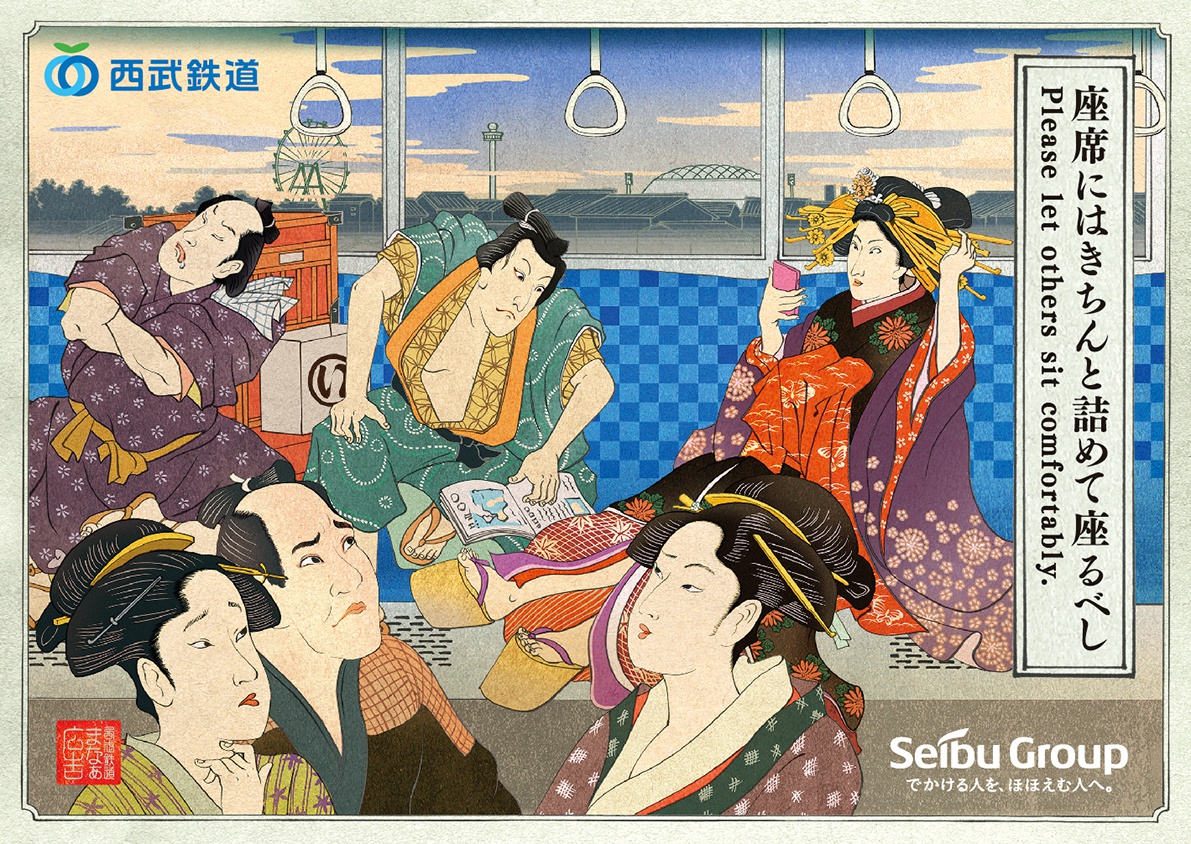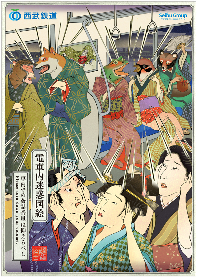 Seibu Railways has been releasing a new poster roughly every new season and so far three different posters have been released*. In Japanese they’re given the title denshanai meiwaku zue (電車内迷惑図絵) which is consistent with traditional ukiyo-e naming conventions and translates roughly to “picture of train car nuisance.”