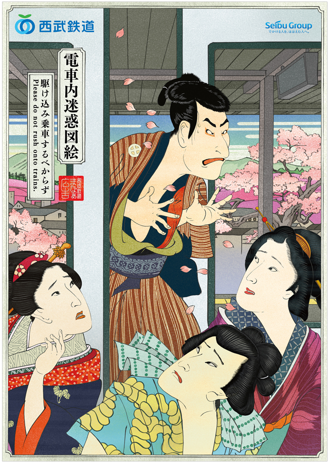 The poster campaign is designed to educate their straphangers on proper train etiquette and manners. Given the surge in tourism in Japan recently, the train company decided to create their posters in an ukiyo-e inspired style.