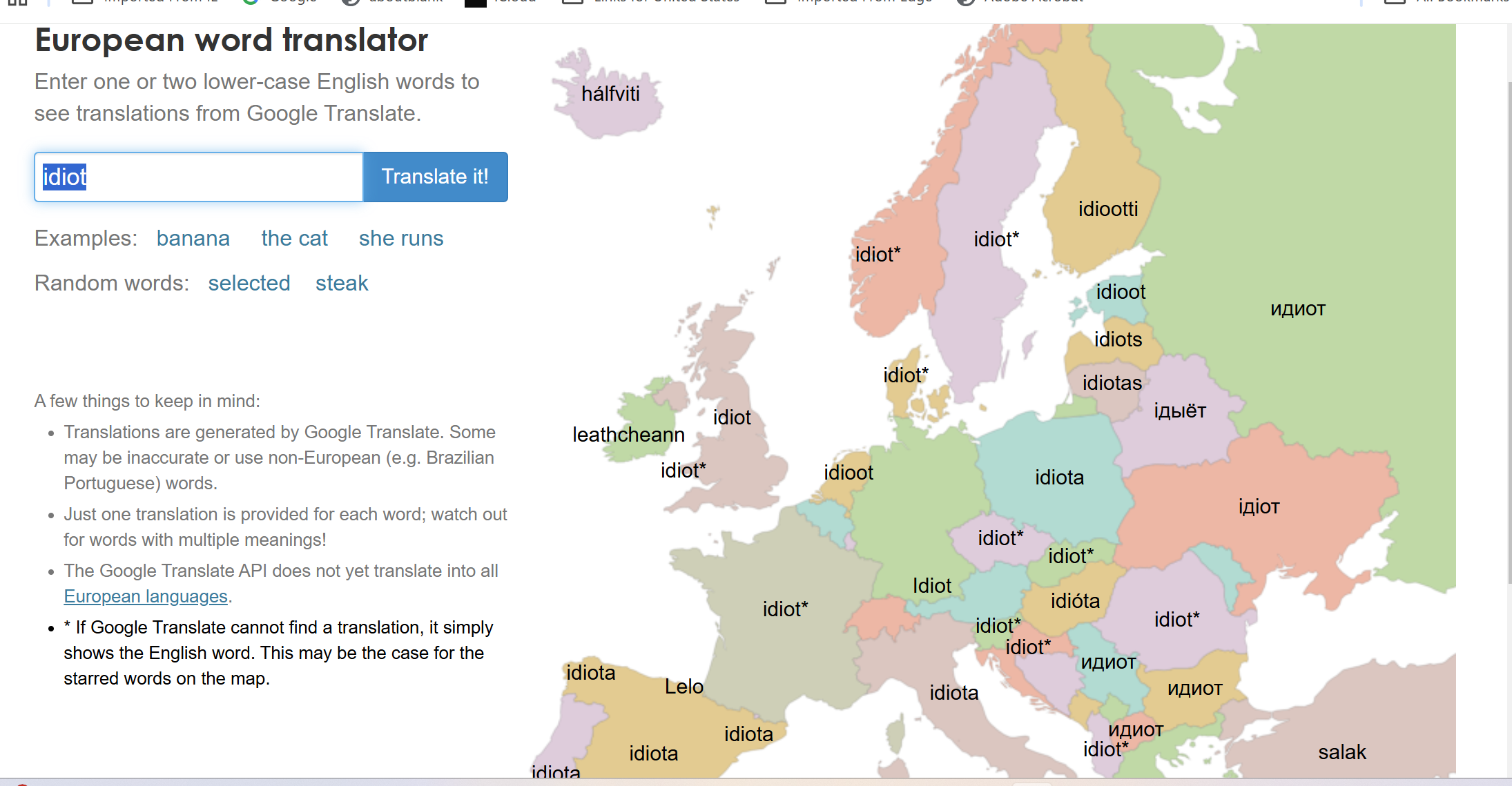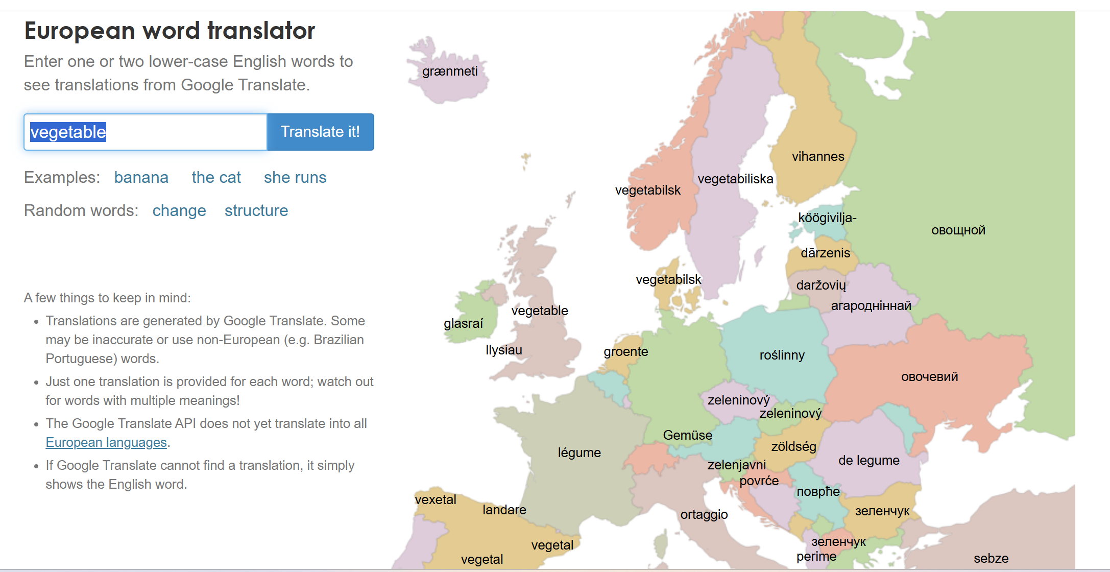 This page was inspired by the etymology maps by Bezbojnicul on reddit. It was built using D3, maps from Natural Earth, and the Google Translate API. The translations were retrieved around 2014, and unfortunately this page is not currently set up to get new translations. You can contribute a few pounds towards the web hosting costs for this site if you really want to! Contact James Trimble.