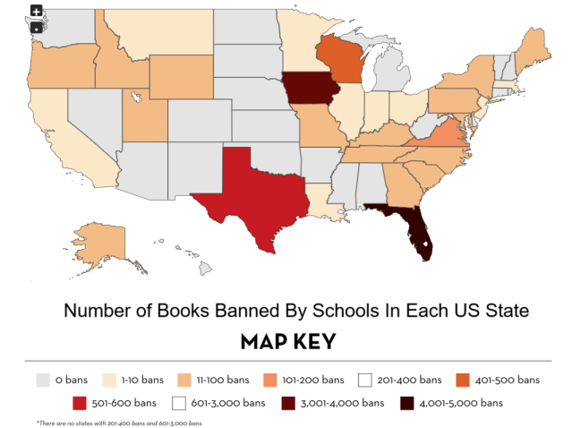 The map above comes from from PEN America, which tracks book bans and fights censorship in public schools and libraries across the country.