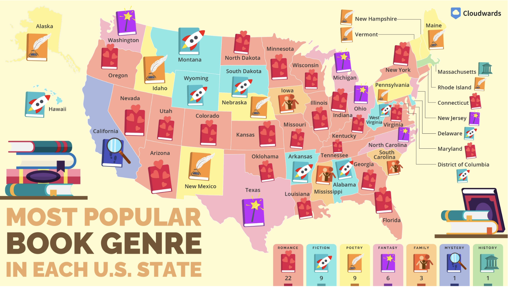 If you believe the main stream media reports, it would seem that folks across the United States have given up on reading and spend all of their time glued to a mobile phone. But those of us in the book biz know that it’s not true. Check out the interesting map above from the geeks at Cloudwards that breaks down reading preferences from State to State.