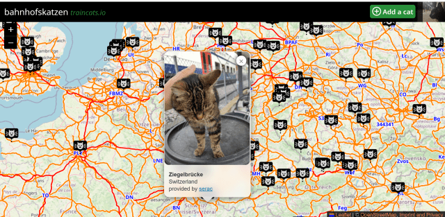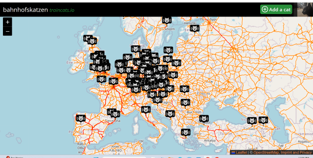 I love cats and I love train stations, so the silly, but fun website BahnhofsKatzen is just my cup of coffee. This site is a well-maintained resource documenting stray cats at train stations around the world, but primarily in mainland Europe. Cat lovers and trainspotters can participate by adding their own cat station pics to the map.