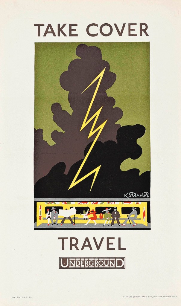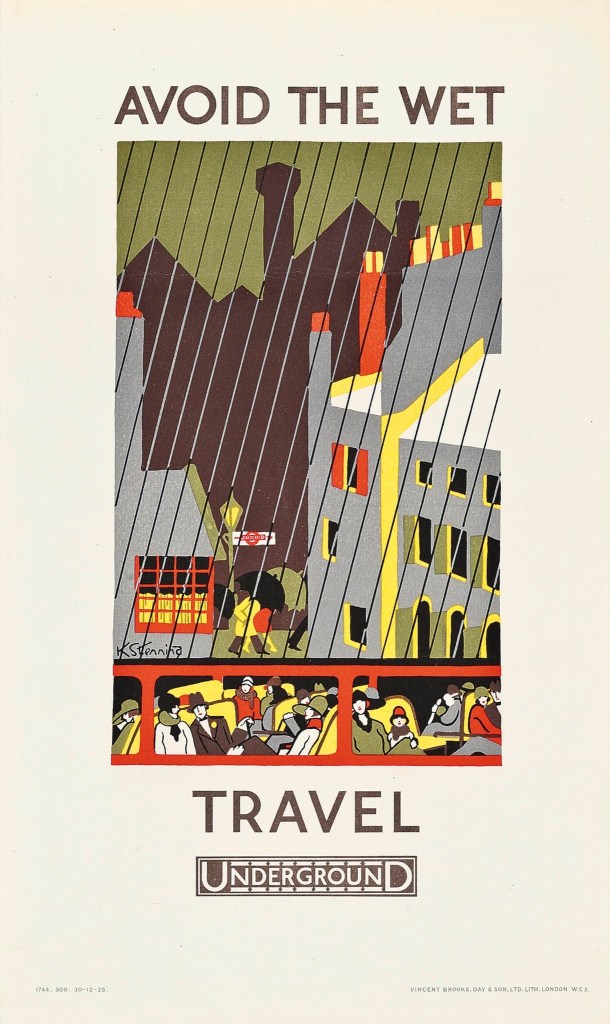 The Underground Electric Company in London published this series of posters in 1925. The set was designed by Kathleen Stenning. Each bold image promotes catching the Tube to escape the predictably unpredictable English weather.