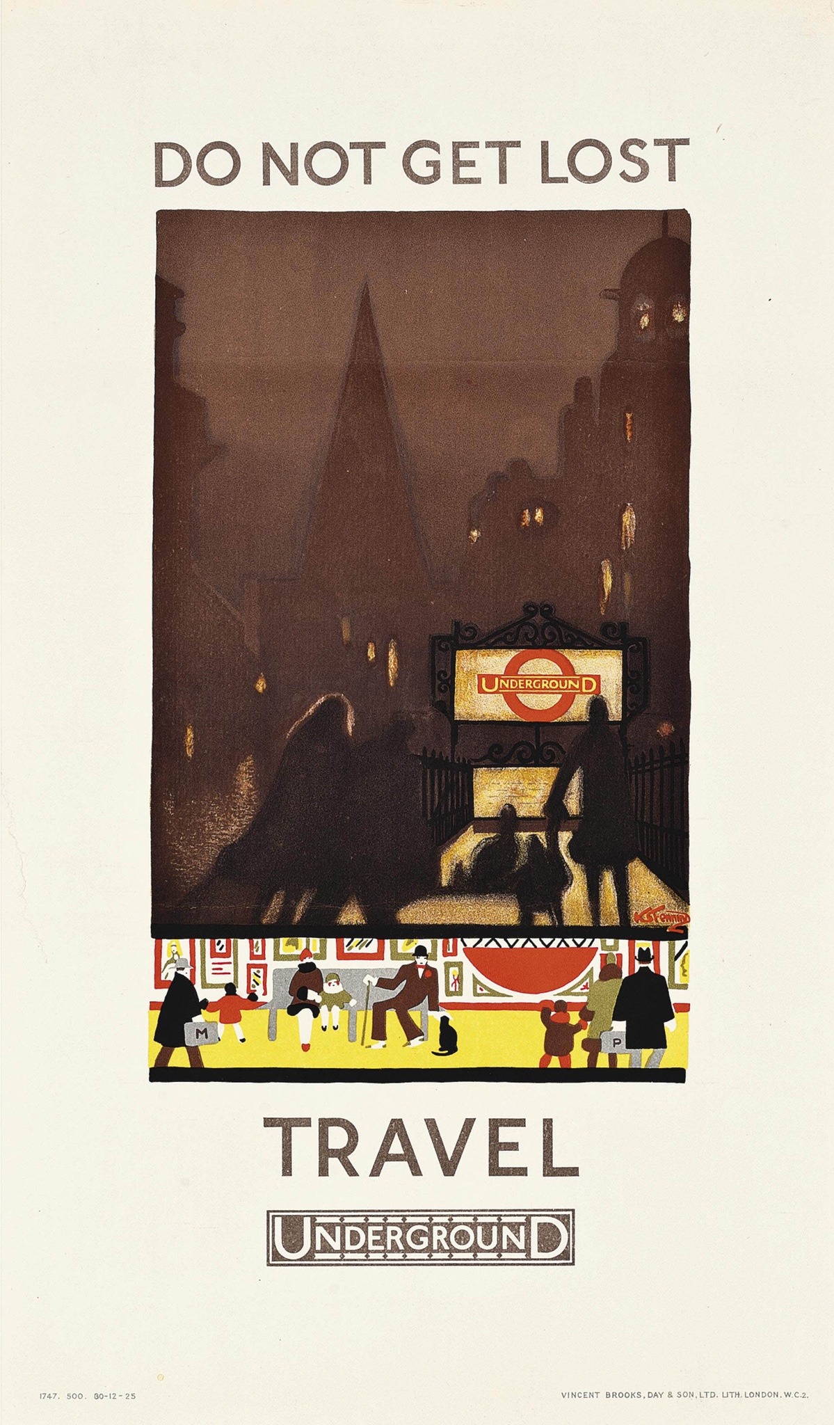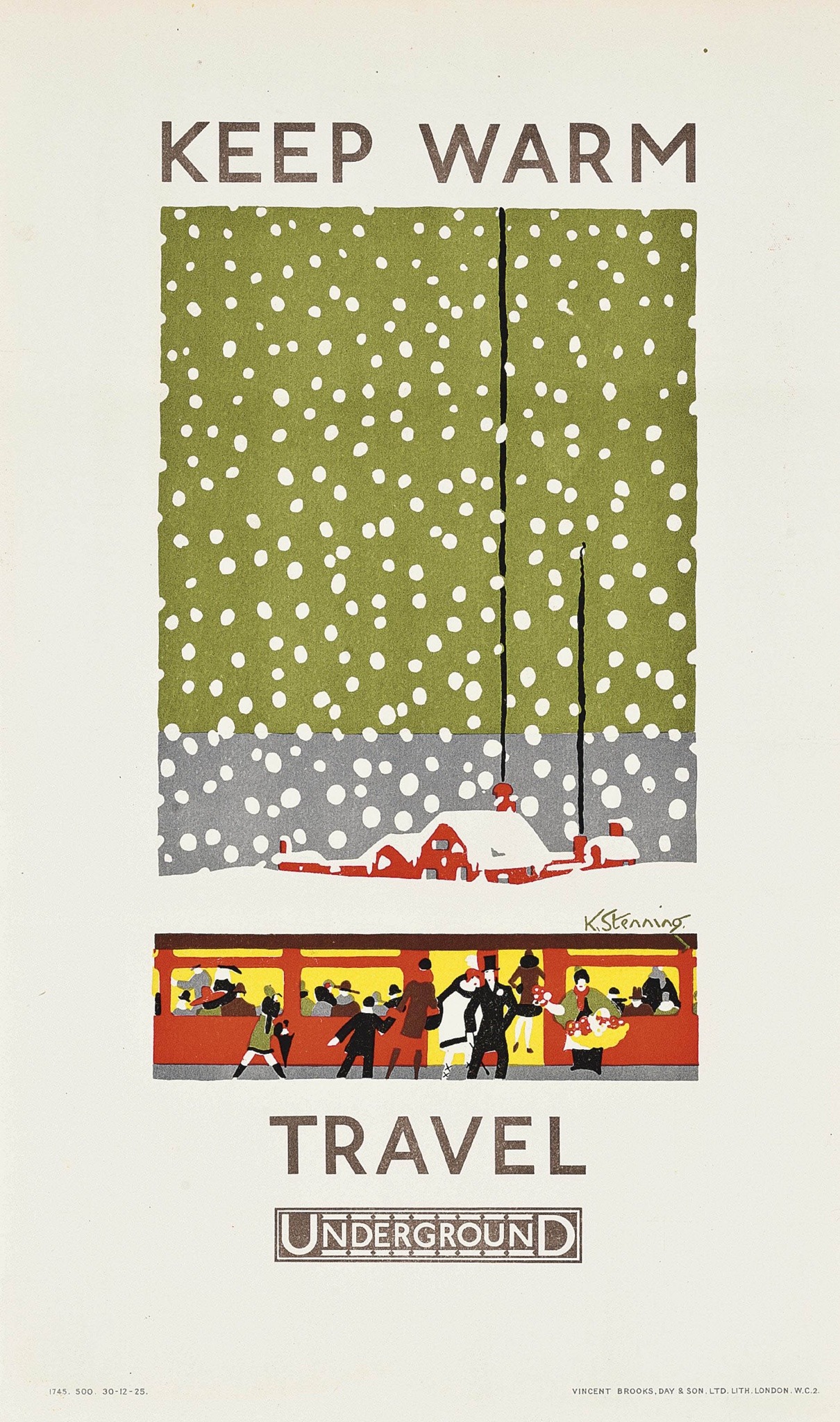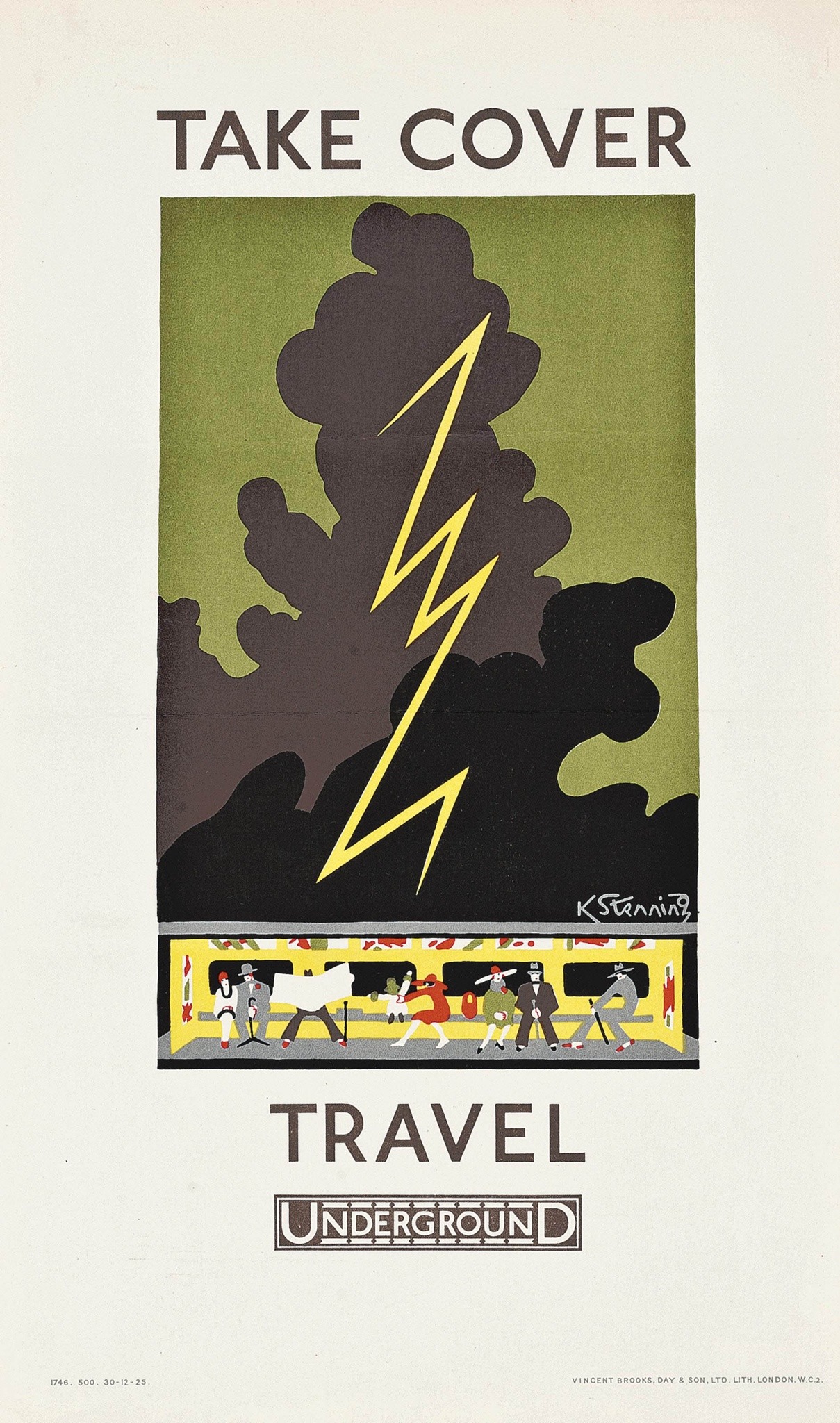 The Underground Electric Company in London published this series of posters in 1925. The set was designed by Kathleen Stenning. Each bold image promotes catching the Tube to escape the predictably unpredictable English weather.