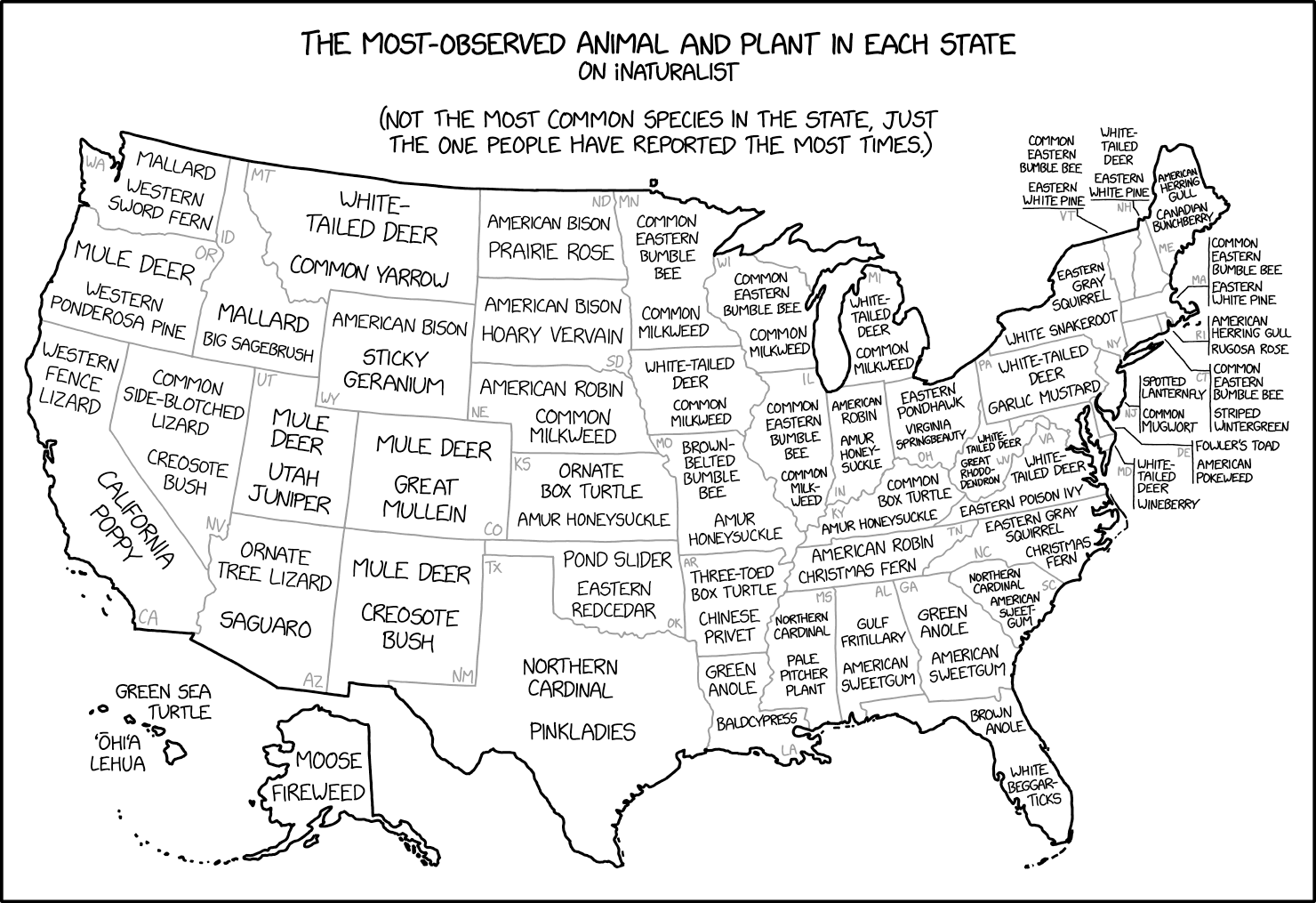 The wonderful, eclectic webcomic site XKCD mapped the most observed plant and animal for all 50 US states as reported by iNaturalist users. I’m not surprised that bumble bees were such a popularly observed animal — the common eastern bumble bee (Bombus impatiens) is most-observed in Vermont, Wisconsin, Maine, Connecticut, Illinois, and Minnesota. Also popular: white-tailed deer, bison, milkweed, honeysuckle, and robins. In my neck of the woods, I’d have to report clover and squirrels, with dandelion and white-tailed deer a close second.