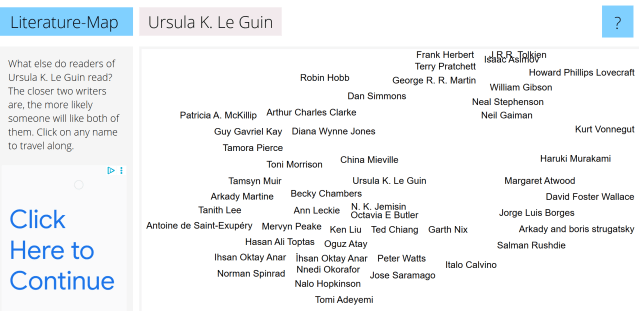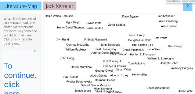 While not really a map this simple tool does map affinity based on user’s literary tastes. It allows you to plug in any author you like and then it shows other writers whom readers of your literary choice also selected. Supposedly, the closer the names, the more readers of X tend to like readers of Y. The dataset is taken from Gnod. And if you can’t really on Gnod, what can you rely on ? Give it a spin. I had some fun with it, but found many proximity connections dubious at best.