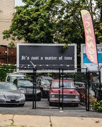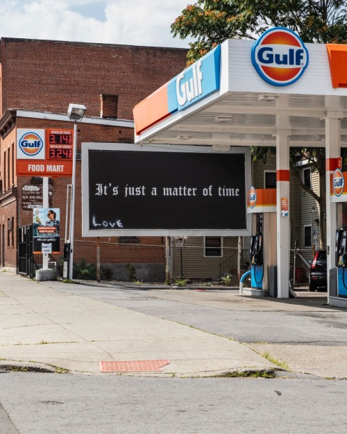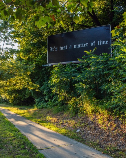 “It’s Just a Matter of Time,” a simple yet evocative phrase, appears on standard billboards in white Gothic typeface on a black background, disrupting the typical flow of commercial information. When the work was first installed in 1992 in Hamburg, the text was written in German: Es ist nur eine Frage der Zeit. The work is ideally installed in 24 outdoor billboard locations, and must be installed in a minimum of six locations. Gonzalez-Torres intended for the billboards to be situated in diverse locations and/or contexts in order to reach a broad cross-section of the general public.
