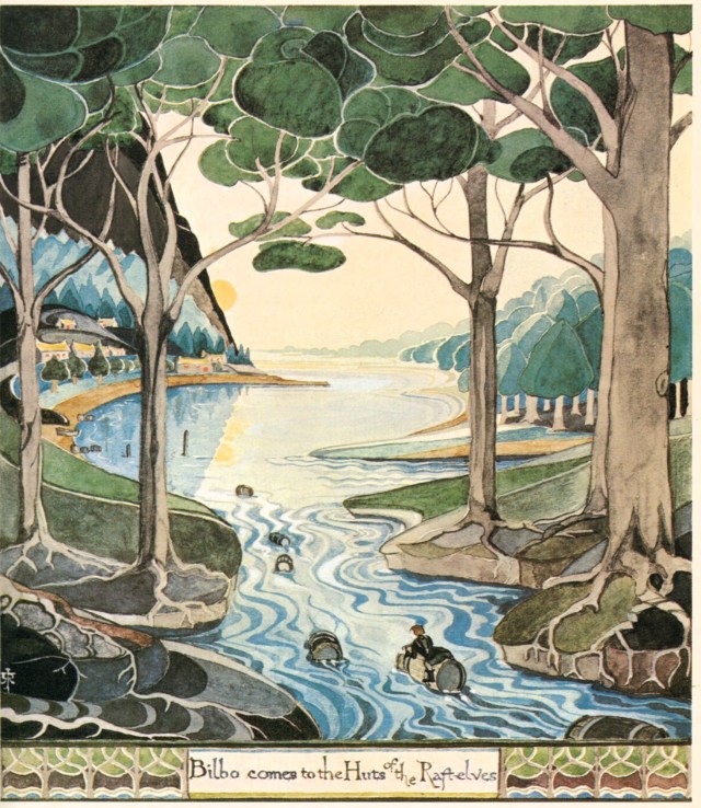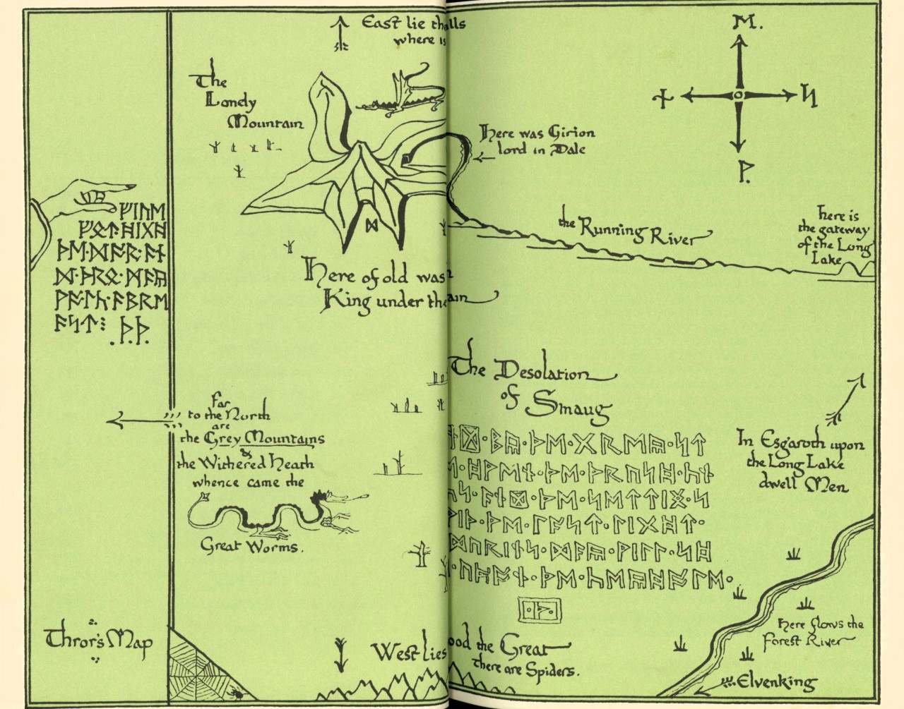 I recently stumbled on a post from a random library blog about one of the most beloved books in the English language. The article focused on a wonderful 1966 American edition published in Boston by Houghton Mifflin. It includes Tolkien’s own illustrations and maps, such as his distinctive rendering of Hobbiton and Thror’s map.
