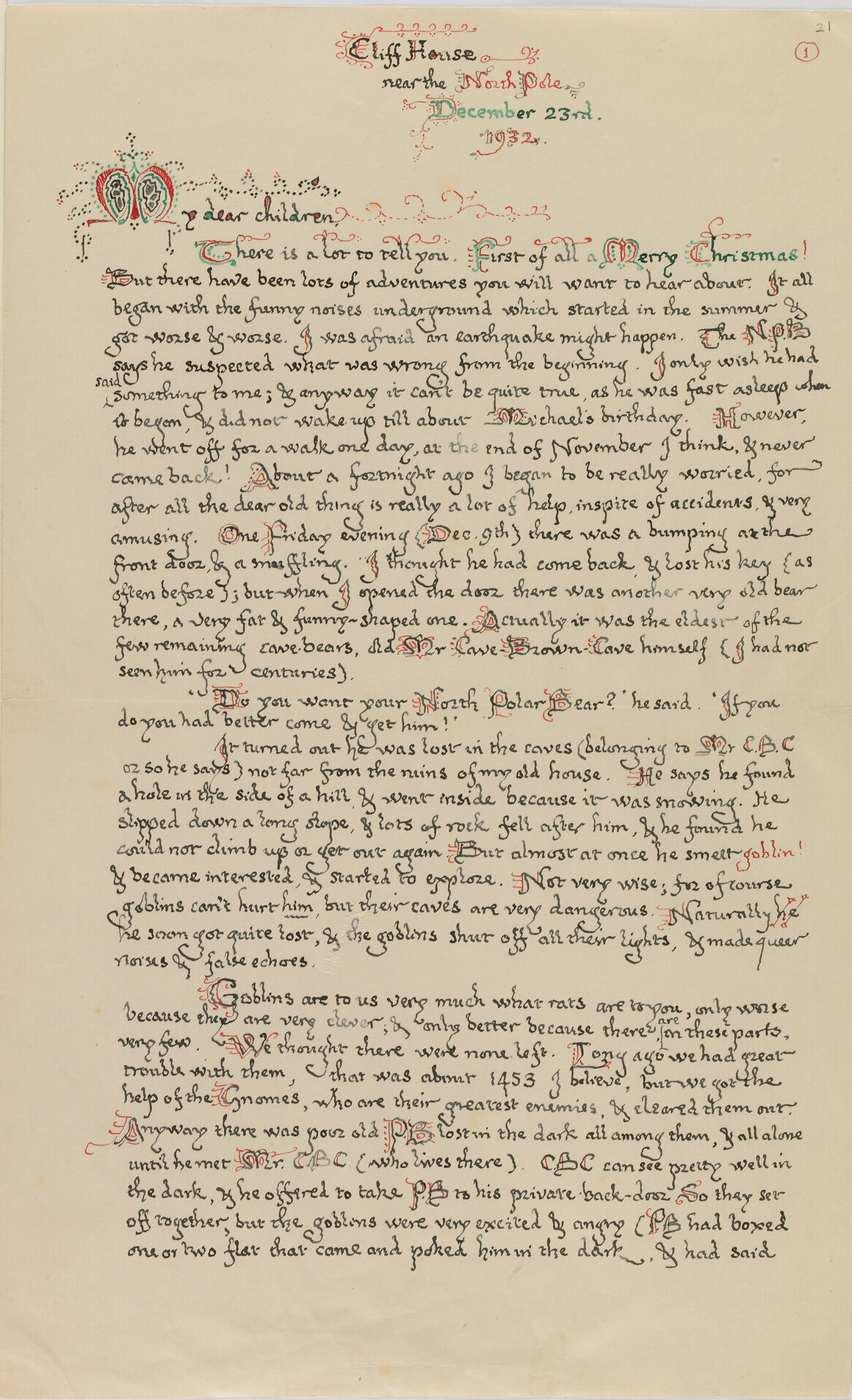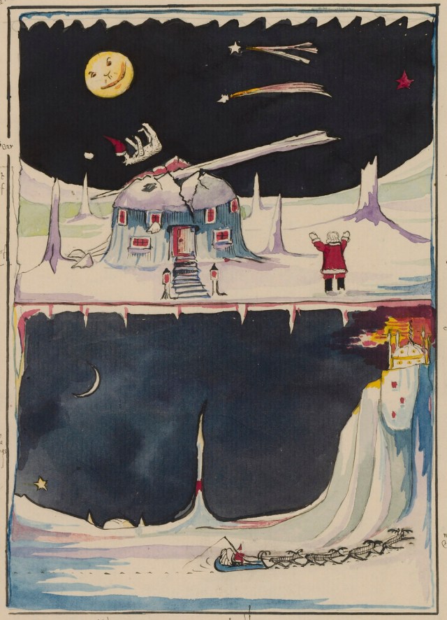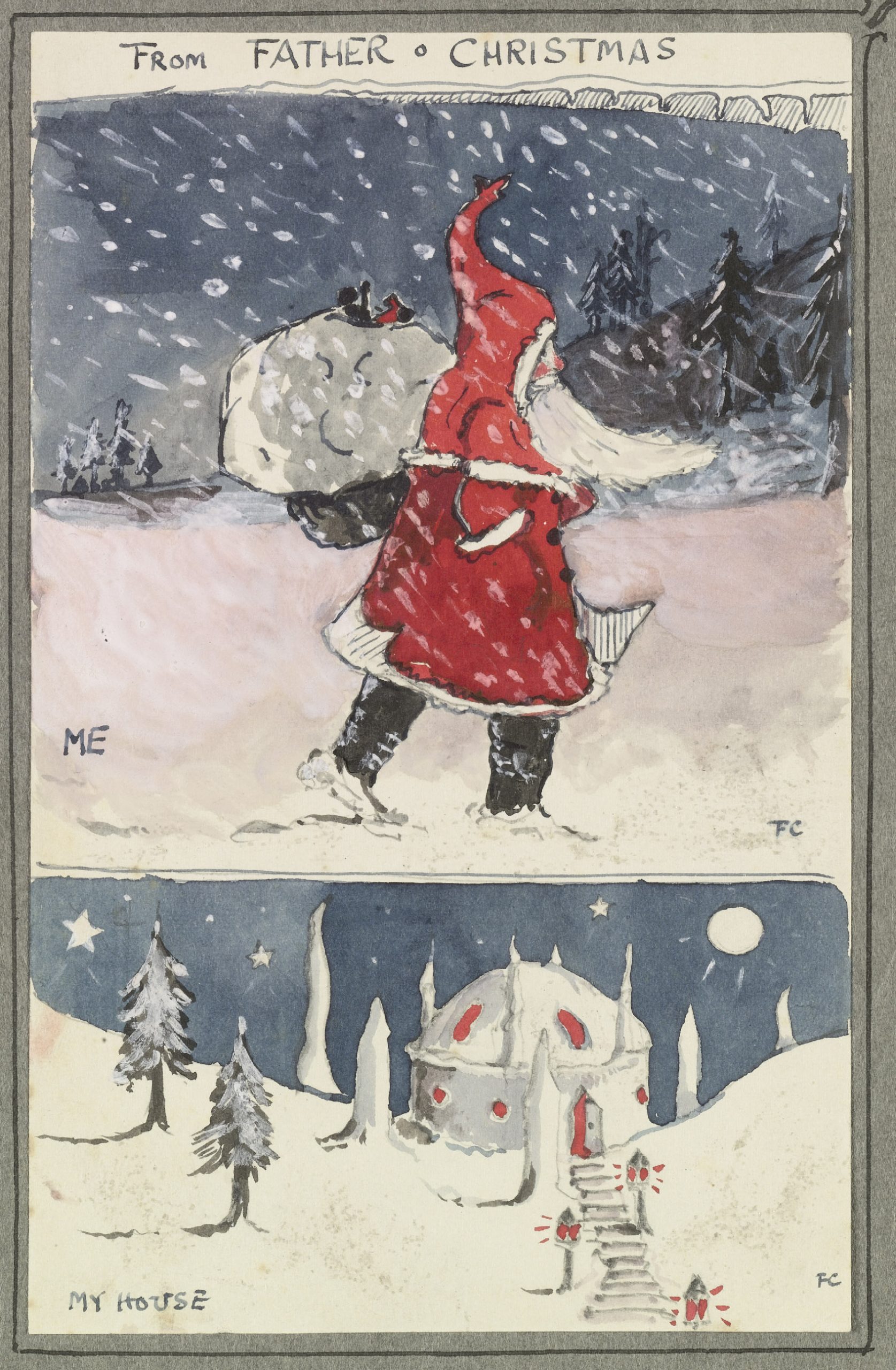 I am dreadfully busy this year — it makes my hand more shaky than ever when I think of it — and not very rich. In fact, awful things have been happening, and some of the presents have got spoilt and I haven’t got the North Polar Bear to help me and I have had to move house just before Christmas, so you can imagine what a state everything is in, and you will see why I have a new address, and why I can only write one letter between you both. It all happened like this: one very windy day last November my hood blew off and went and stuck on the top of the North Pole. I told him not to, but the N.P.Bear climbed up to the thin top to get it down — and he did. The pole broke in the middle and fell on the roof of my house, and the N.P.Bear fell through the hole it made into the dining room with my hood over his nose, and all the snow fell off the roof into the house and melted and put out all the fires and ran down into the cellars where I was collecting this year’s presents, and the N.P.Bear’s leg got broken. He is well again now, but I was so cross with him that he says he won’t try to help me again. I expect his temper is hurt, and will be mended by next Christmas. I send you a picture of the accident, and of my new house on the cliffs above the N.P. (with beautiful cellars in the cliffs). If John can’t read my old shaky writing (1925 years old) he must get his father to. When is Michael going to learn to read, and write his own letters to me? Lots of love to you both and Christopher, whose name is rather like mine.