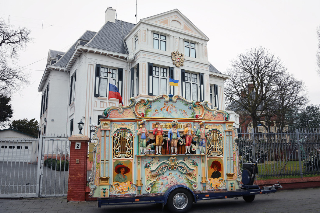 Every year on the anniversary of the Russian invasion of Ukraine, artist Teun Castelein charters barrel organs to play the Ukrainian national anthem all day long directly in front of the Russian embassy in The Hague. Each year he adds one more organ. This year there were four and they all played out of tune to maximize the annoyance factor.