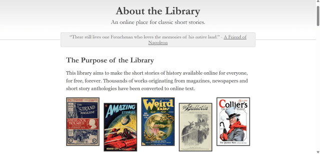 The Library of Short Stories is a wonderful, and completely free, website dedicated to classic short stories. Offering a wide range of genres from around the world, the Library is the work of Melbourne based author and web developer Evan C. Lewis.