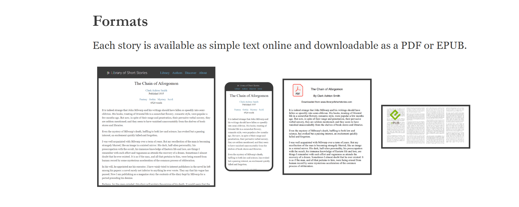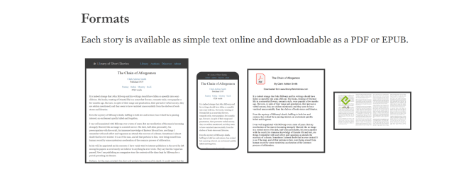 Each story is available as simple text online and downloadable as a PDF or EPUB.