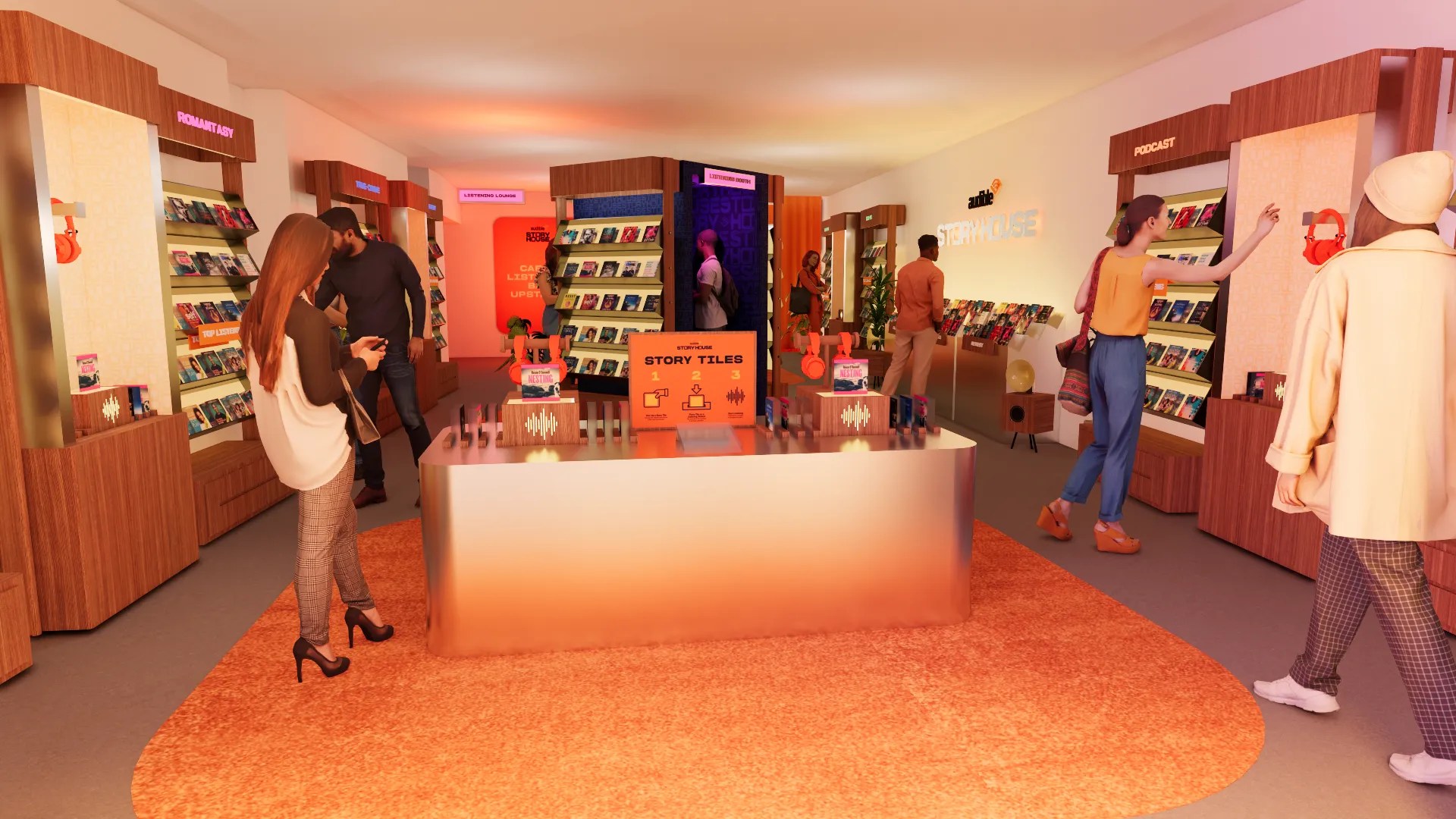 The Audible Story House will only be open during the month of May, featuring story “tiles” that visitors can use to sample audiobooks, along with seven “listening spaces” equipped with Sony headphones and Dolby Atmos surround sound. Here are some renderings of what the pop-up might look like: