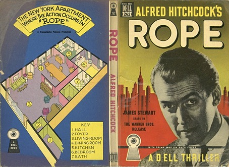 I was always intrigued by the Dell Mapbacks books. They used a clever eye-catching gimmick by adding a map for each title regardless of whether the contents warranted such a thing. Dell began life as a publisher of mysteries, hence the logo of an eye peeping through a keyhole. Maps are more justifiable if applied to a detective story, where a map may help the reader picture the layout of a location or trace the movements of a character. But once Dell branched out into other areas of fiction the maps seemed increasingly superfluous, especially those that limit themselves to the plan of an office or apartment. For some there’s also the question of accuracy. The novelization of Alfred Hitchcock’s Rope shows a map of the apartment that doesn’t correspond to the layout of the rooms as they’re seen on the screen, something that readers who’d seen the film would have been quick to recognize.